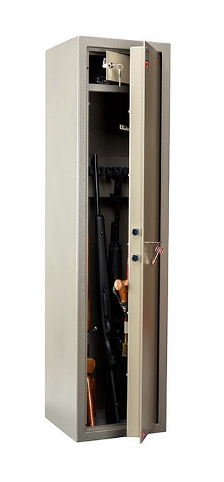 Предназначены для хранения огнестрельного оружия сейфы соответствуют требованиям ст.59 Постановления правительства РФ № 814 от 21 июля 1998 года О мерах по регулированию гражданского и служебного оружия и патронов к нему на территории РФ Толщина металла лицевой панели - 5мм, корпуса - 3мм Вместимость сейфа -5 стволов Максимальная высота ствола 1395 мм Размер патронного отделения 141х348х173 мм (усеченное) Комплектуются ключевым замком Цвет- корпус и двери имеют различные оттенки коричневого с эффектом молотковой эмали