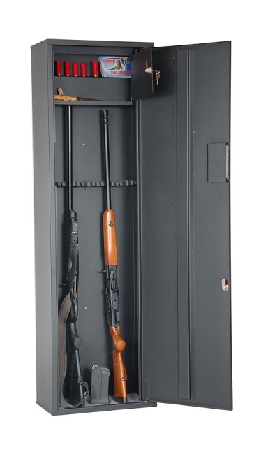 Шкаф оружейный ОШН-7Э предназначен для хранения оружия, патронов и принадлежностей. Шкаф соответствует требованиям МВД России. Толщина металла корпуса и двери 1 мм. Вместимость сейфа 5 стволов. Максимальная высота ствола 1335 мм. Сейф комплектуется трейзером, пластмассовыми ложементами, ковриком. Дверь сейфа закрывается кодовым электронным замком и ключевым замком ЗАО "Про-Сам" г. Рязань. На задней стенке корпуса расположены два отверстия для крепления. Цвет - черный