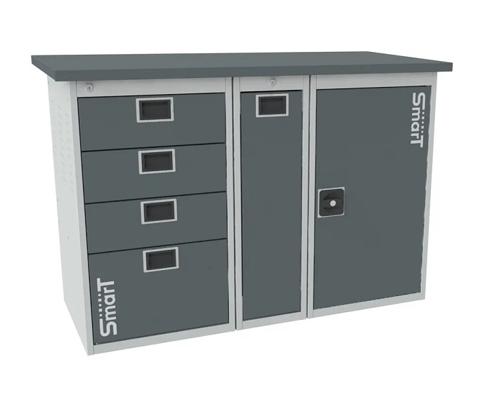 Дополнительно на верстак можно установить: перфорированный экран SMART, комплект освещения SMART, аксессуары на экран SMART, возможна установка системы мастер ключ.