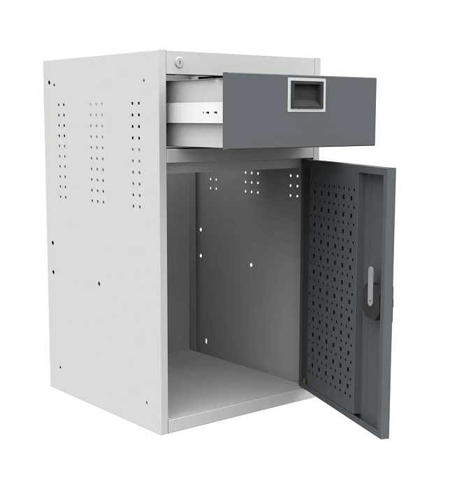 В комплектацию верстака входит: столешница 1760 SMART, тумба SMART 4, тумба SMART 1-1, тумба-пенал SMART, ящик подвесной Smart-1, два перфорированных экрана SMART 1760, комплект косынок для экрана SMART, две стойки 1150 для крепления 2го экрана Smart/Woker ral 7035, комплект освещения SMART. Столешница выполнена из фанеры 27 мм со стальной окрашенной накладкой 1,2 мм. Тумба SMART 1-1 комплектуется одной дверью, одним выдвижным ящиком. Тумба SMART-4 комплектуется 4 выдвижными ящиками. Выдвижные ящики оборудованы телескопической системой полного выдвижения ящиков с фиксацией в закрытом состоянии (50000 циклов). Тумба-пенал SMART выдвигается на четырех телескопических направляющих и предназначена для хранения крупногабаритных инструментов и аксессуаров. Ящик подвесной Smart-1 прикручивается под столешницу верстака. Все тумбы закрываются ключевым цилиндровым замком. Секретность замка 2000 комбинаций (2 ключа в комплекте). Внутренние стенки дверей и перфорированный экран имеют универсальную перфорацию для размещения навесных элементов. Шаг квадратной перфорации (10 мм) - 38х38 мм, круглой (7 мм) - 25х38 мм. Возможна смена стороны открывания двери тумбы. Цвет верстака: корпус тумб - серый Ral 7035, столешница, двери тумб, лицевая панель ящиков - антрацит Ral 7016. Поставляется в разобранном виде.