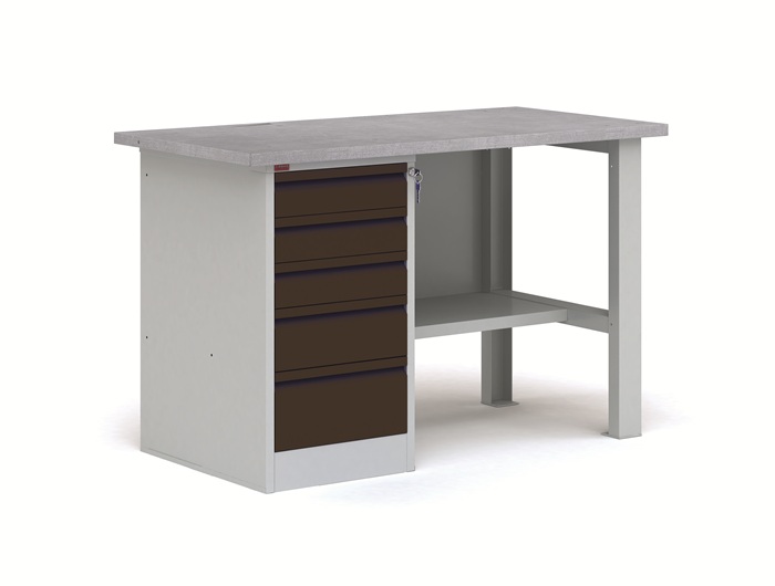 В комплект верстака ВП-3/1,2 входит: столешница СТ-1,2 из МДФ, покрытая оцинкованным листовым металлом, комплект К-2/1,2 (стенка задняя металлическая, металлическая верстачная опора), тумба Т-2 с пятью выдвижными ящиками. Тумба закрывается центральным ключевым замком. Тумбу можно установить как с левой, так и правой стороны верстака.