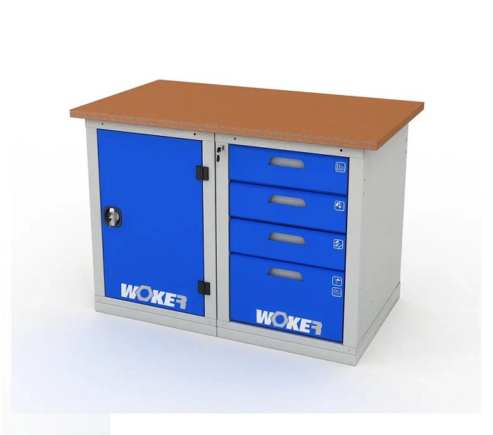 В комплектацию верстака входит: столешница Woker 1200, тумба Woker 01, тумба Woker 04. Столешница выполнена из шлифованной березовой многослойной фанеры толщиной 30 мм. Снаружи фанера обработана влагостойким антисептиком цвета "красное дерево", что придает фанере повышенную влагостойкость и более темный цвет. Тумба Woker 01 имеет две регулируемые по высоте полки (шаг 50 мм). Полки тумбы установлены на стальные салазки, которые позволяют выдвигать полку на себя на 70% для облегчения разгрузки/погрузки. Дверь тумбы закрывается на цилиндрический замок со стальной поворотной ручкой, секретность замка 2000 комбинаций. Открывание двери на 180 градусов. Тумба Woker 04 комплектуется 4 выдвижными ящиками (3 высотой - 135 мм и 1 высотой - 275 мм). Полезный размер ящика: (ШхГ) 459х612 мм. В ящиках есть противоскользящие коврики и набор наклеек с пиктограммами для маркировки содержимого.