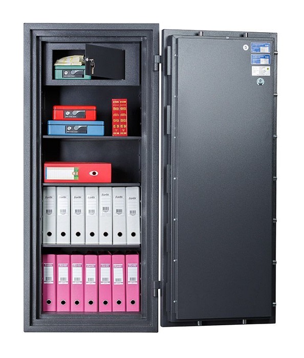 Сейф Valberg Гарант Евро-165Т EL предназначен для сохранности документов и ценностей при пожаре и взломе. Одобрен ассоциацией Российских производителей и поставщиков сейфов и банковских систем безопасности. Рекомендованная сумма хранения денег до 6 500 000 руб для физических лиц, до 2 000 000 руб для юридических лиц. Устойчивость к взлому в соответствии с ГОСТ Р 50862-2017 -2 класс. Устойчивость к огню в соответствии с ГОСТ Р 57384-2017 - 60Б. При заливке двери и корпуса сейфа используется запатентованная система армирования огнестойкого бетона. Общая толщина двери 105 мм, толщина защитного слоя двери 33 мм, общая толщина стен 77 мм, толщина задней стенки 51 мм. В сейф установлен кодовый электронный замок PS 610/Е36 усиленный огнестойким уплотнителем. Количество ригелей 11. Сейф оснащен 3-х сторонней ригельной системой запирания, защитой замка и ригелей от высверливания и выбивания, системой блокировки ригельного механизма при выбивании замка. Предусмотрено анкерное крепление к полу. Анкерные болты в комплекте